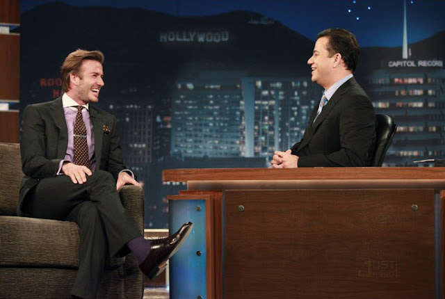 Another rule-of-thumb: match your socks to your tie color or socks to your shirt color (Like Mr. Beckham is doing). This is a great way to ease into wearing colored socks.
